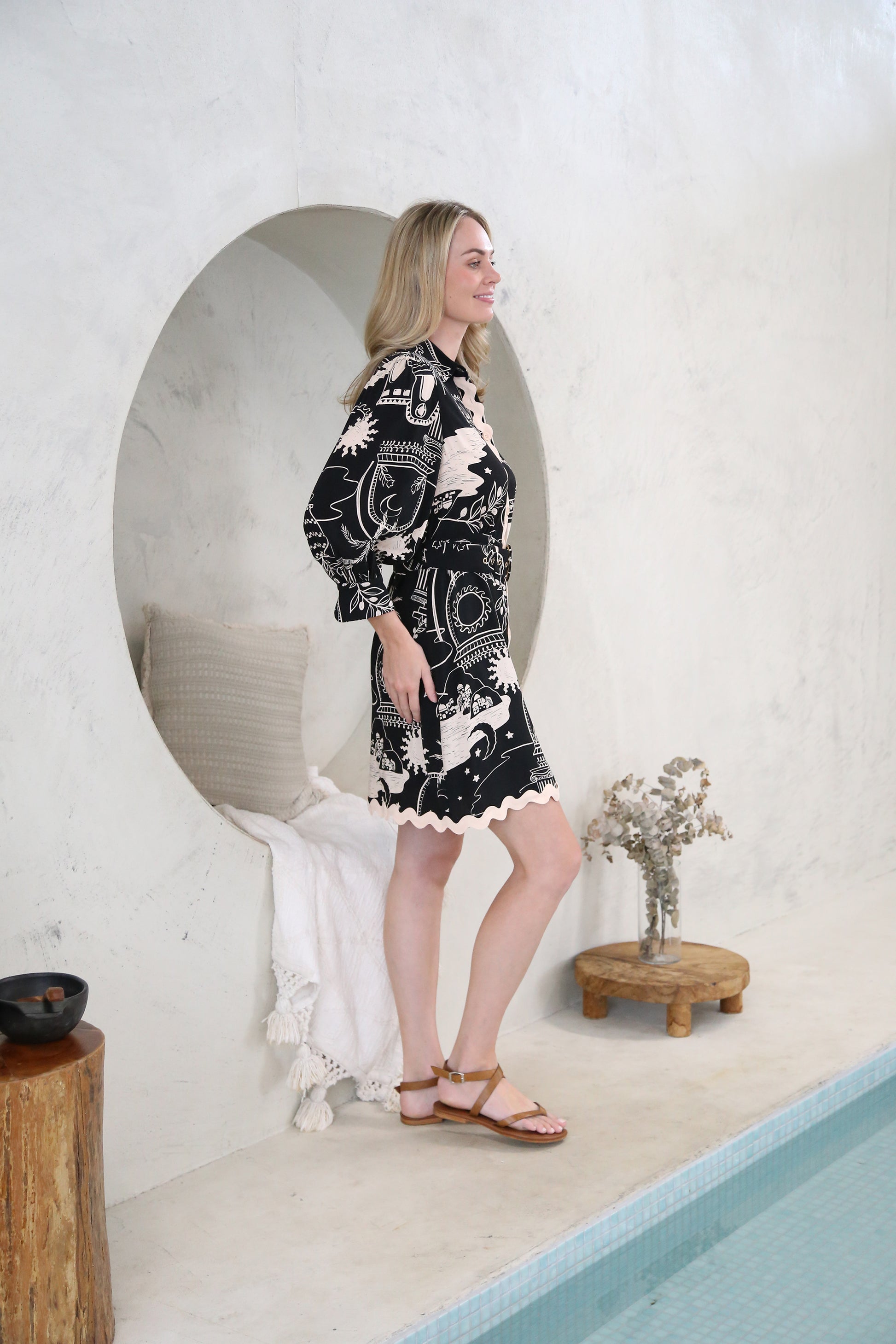 Cute mid season dress with a lined skirt. Elastic cuff 3/4 sleeve and cinches in at the waist with a fabric belt. Great trans seasonal piece.