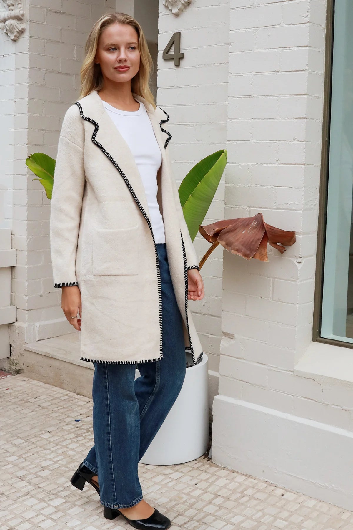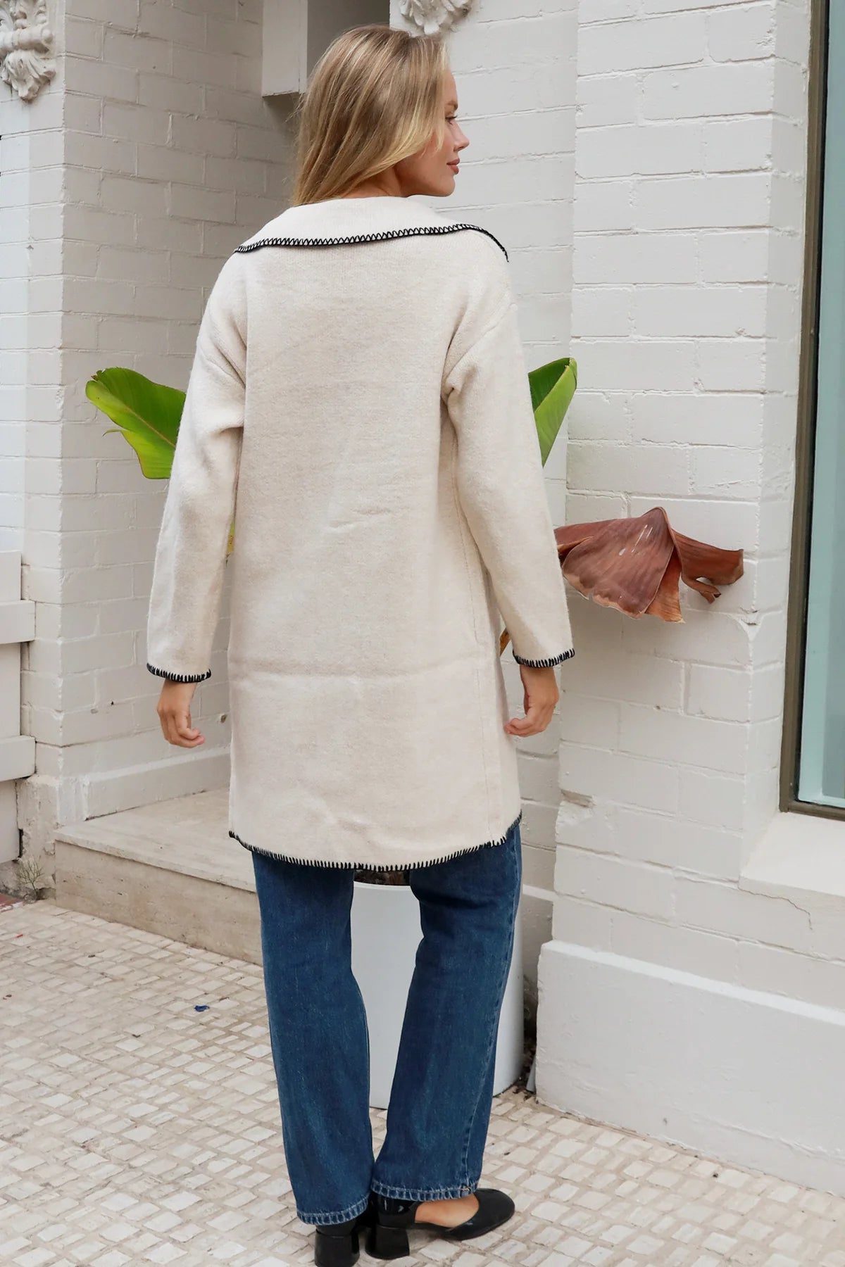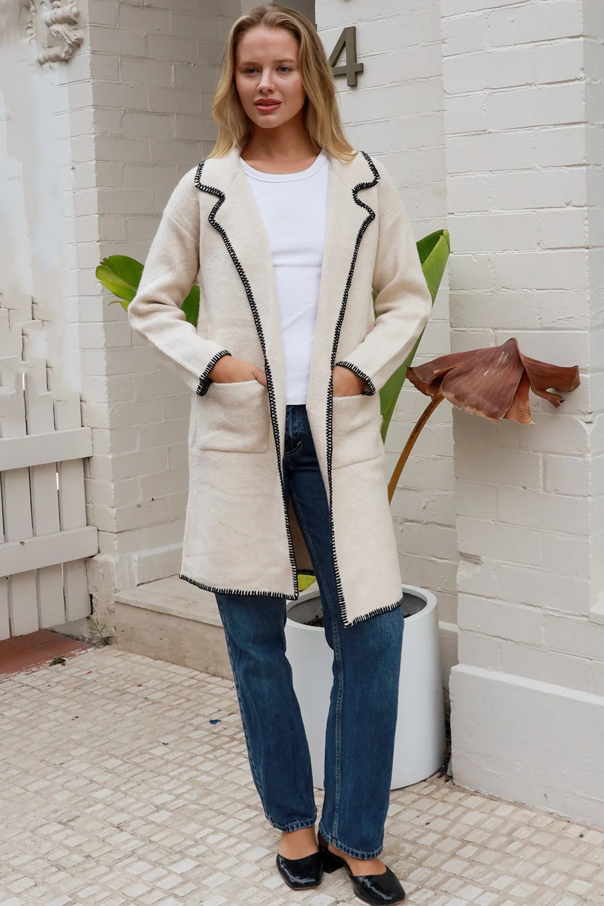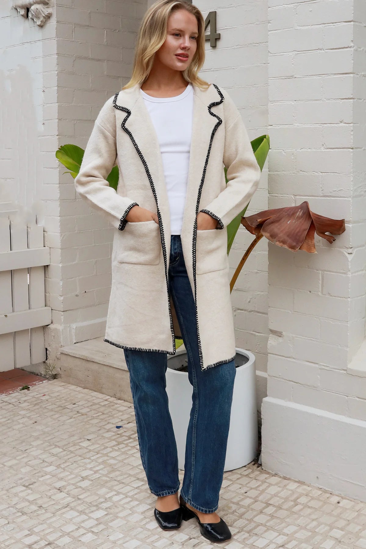 This sophisticated cream coatigan features striking black blanket stitch trim along the lapels, pockets, and cuffs for elegant contrast and visual interest. The relaxed silhouette and premium wool blend combine comfort with polished style, making it a versatile statement piece for your seasonal wardrobe.