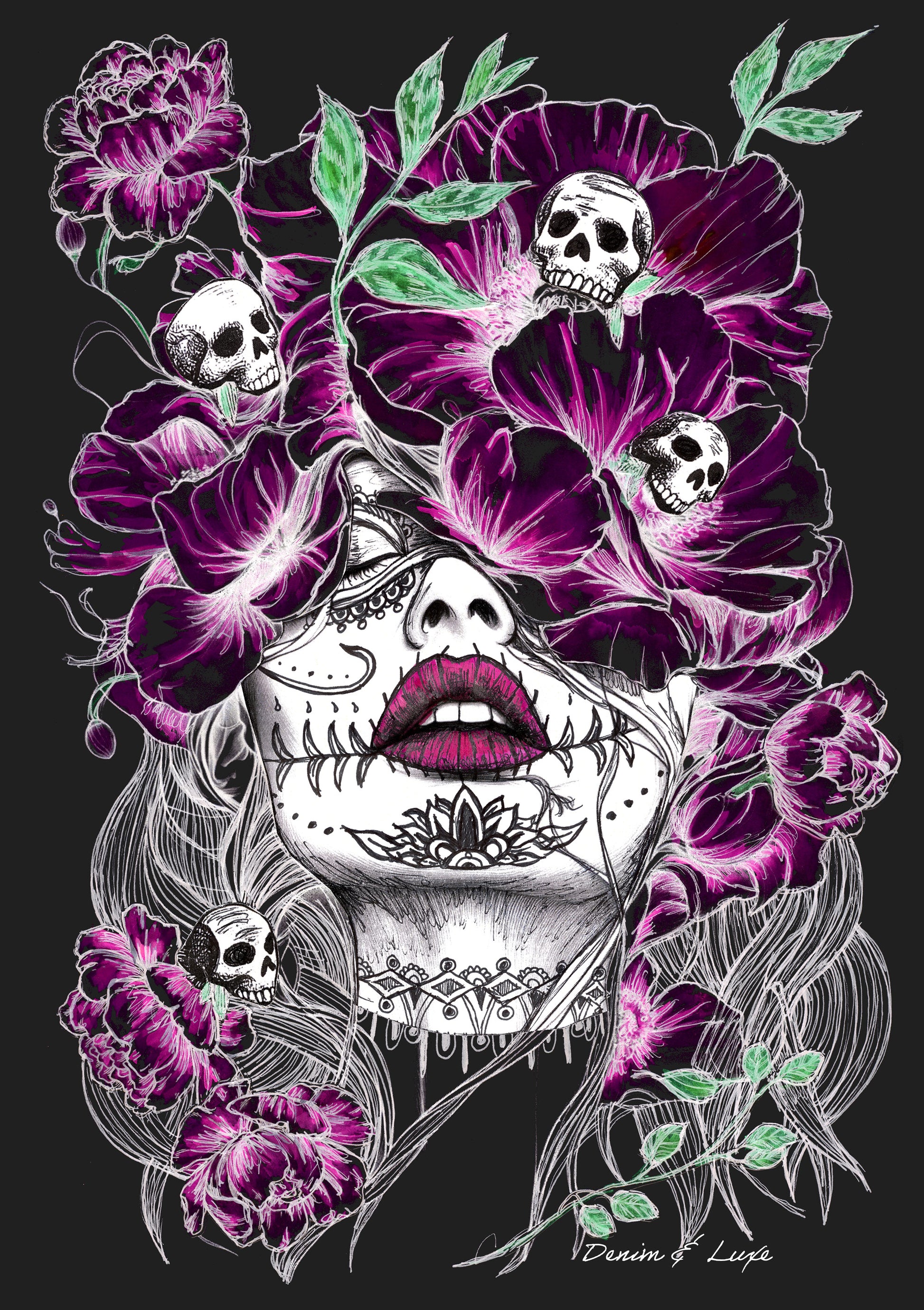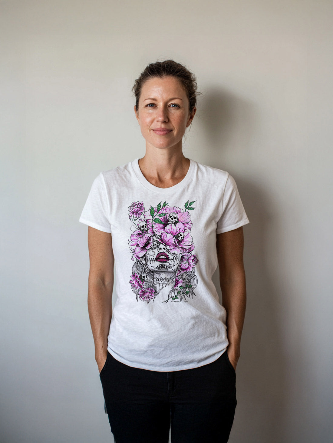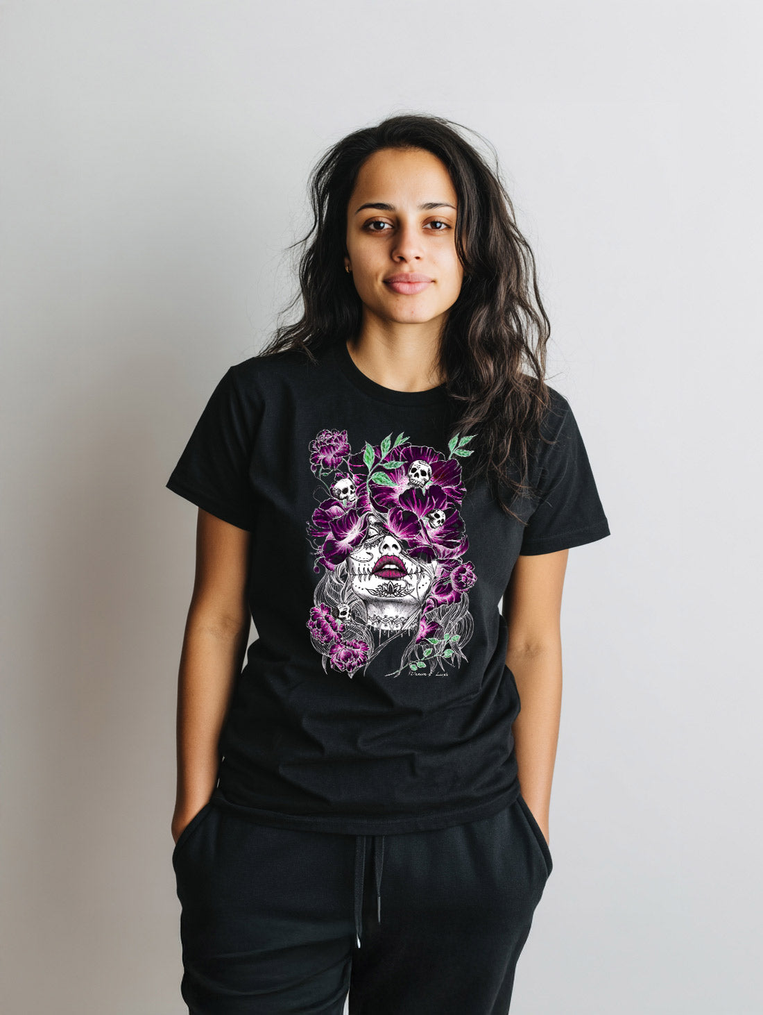 What a sassy stunner — this black or white T-shirt bursts with rock goddess, featuring a vibrant purple floral skull design Its soft, comfy fit and short sleeves make it perfect for playful outings, paired with your favorite bottoms.