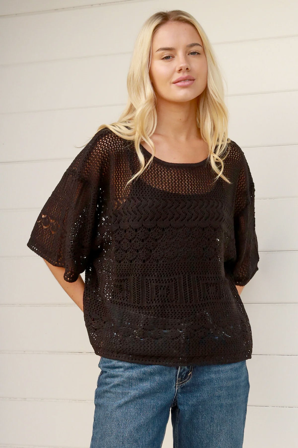 Elevate your wardrobe with our Elegant Black Crochet Overlay Top, designed for the sophisticated woman who values timeless style and effortless comfort.