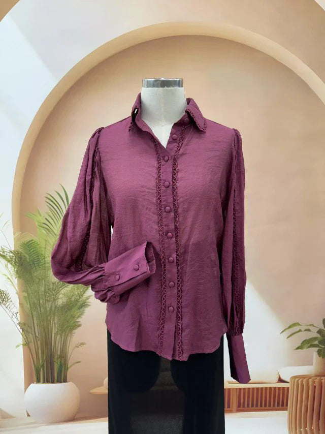 What a dreamy find — this rich plum blouse is pure sophistication with a playful twist! Its flowing bishop sleeves, delicate covered buttoned front, and subtle lace trim make it a joy to wear, whether paired with trousers or a skirt.