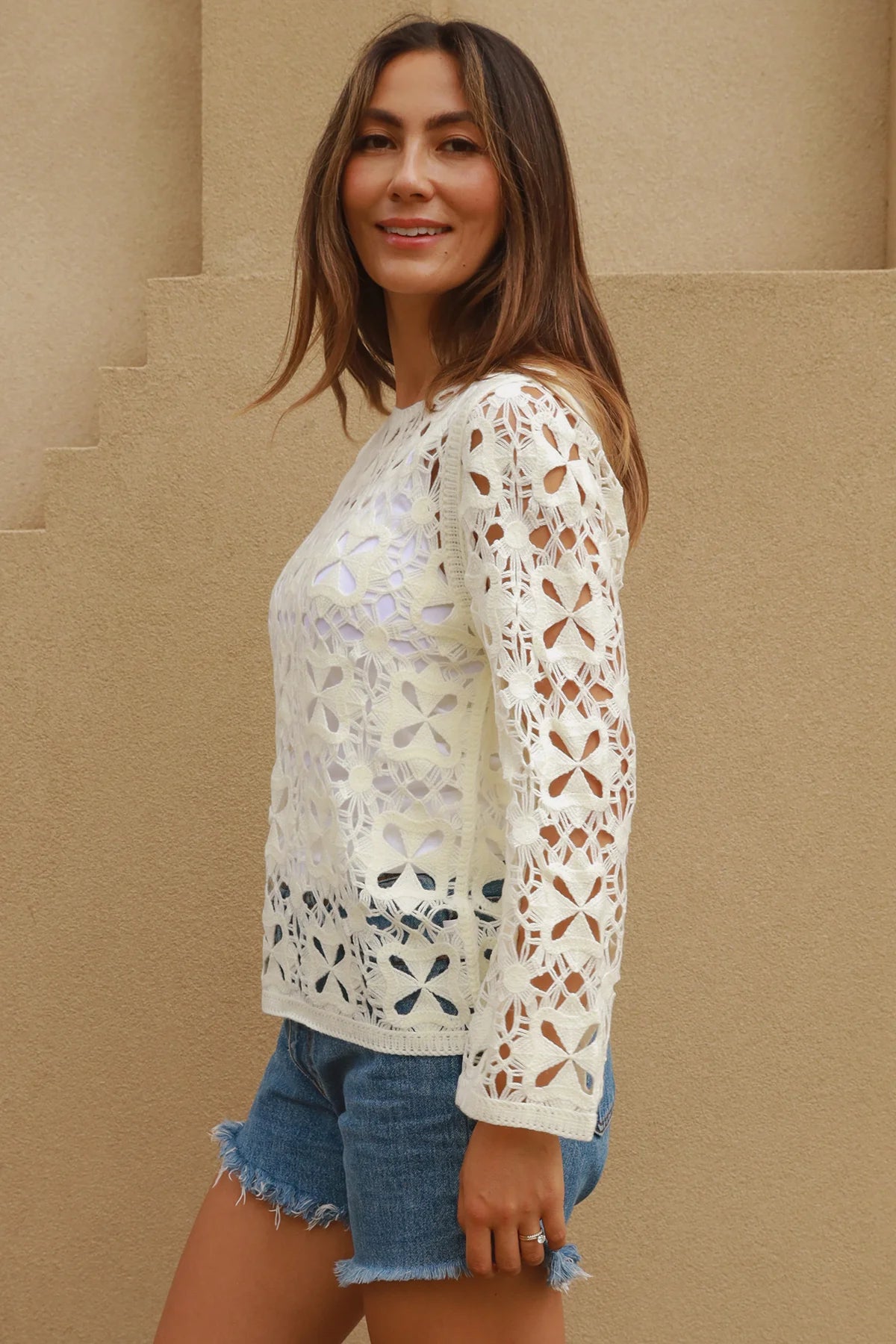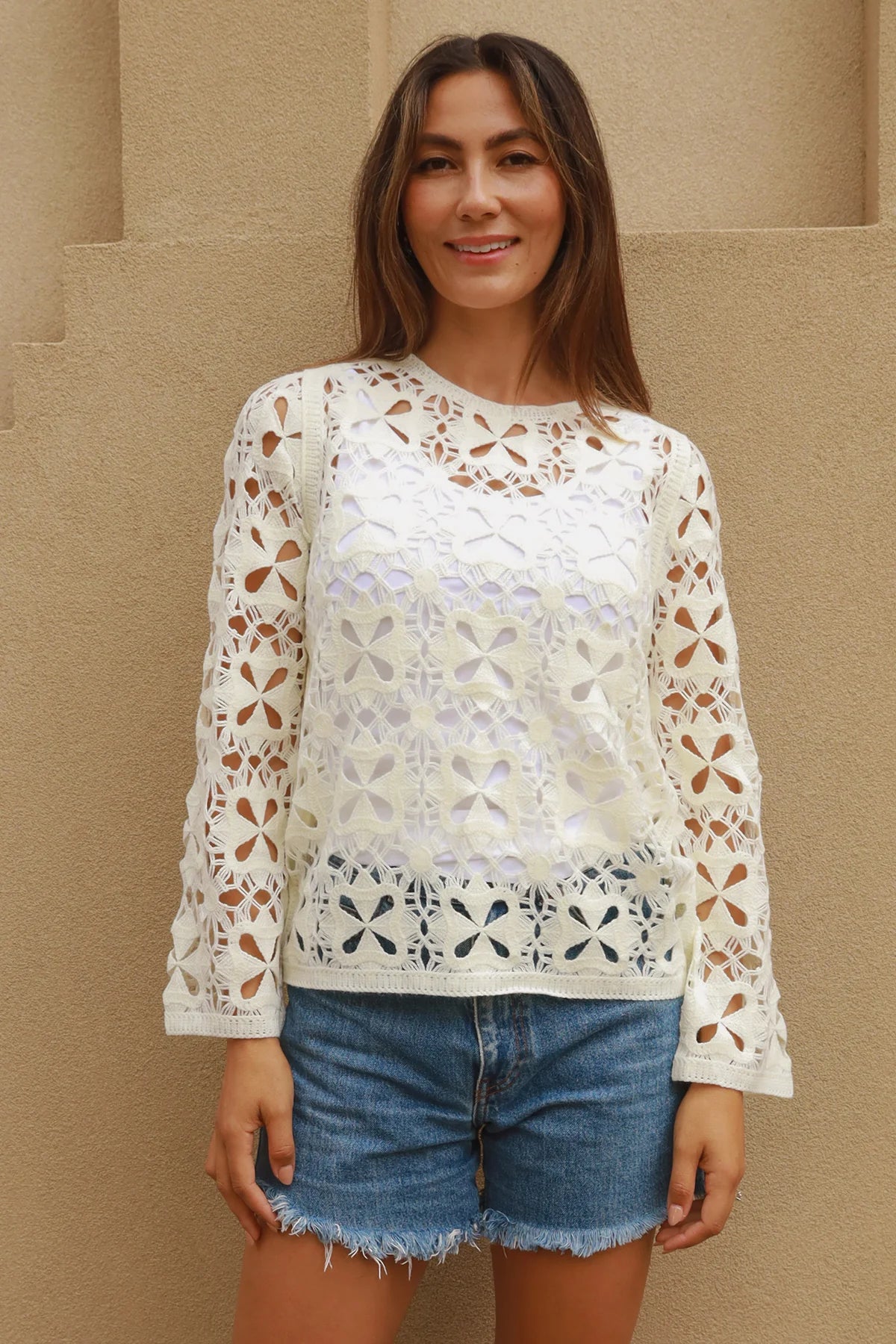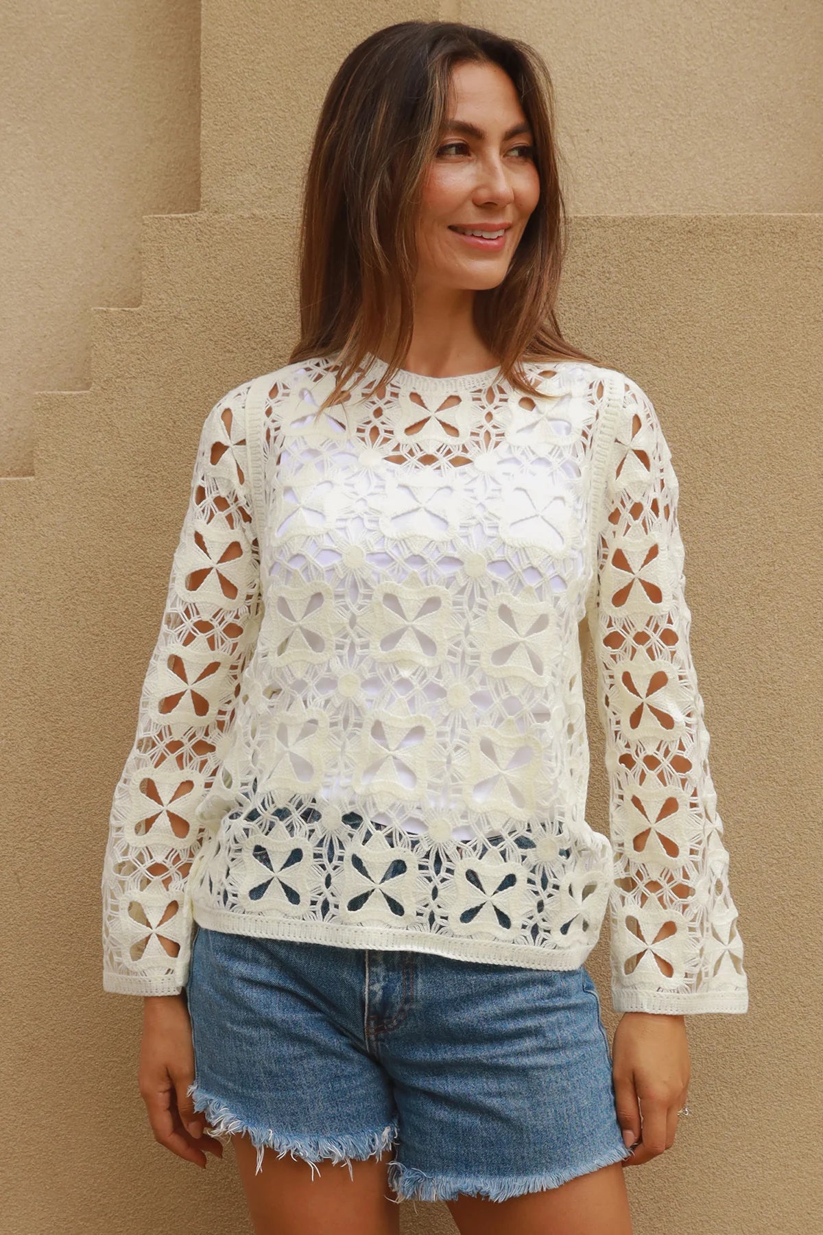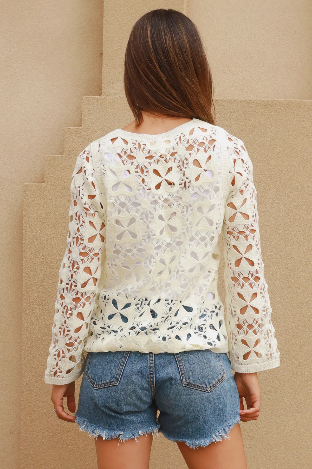 What a whimsical find—this white lace top is a playful twist on elegance! Its delicate floral cutouts and flowing long sleeves bring a breezy, carefree vibe. Perfect for pairing with denim shorts or a skirt for a fun, stylish look.