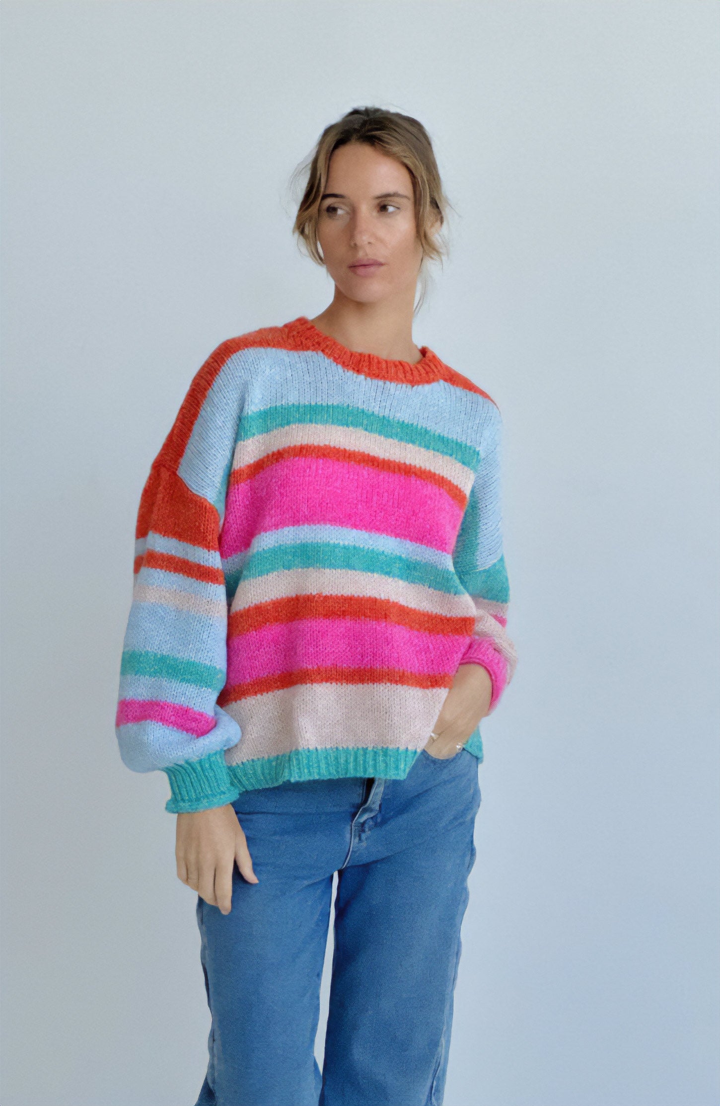 This cozy jumper bursts with vibrant stripes in pink, teal, and orange, bringing a cheerful pop of color to your wardrobe while its fluffy knit and relaxed fit make it a fun, snuggly choice for chilly days. It’s perfect for the mature lady who loves to sprinkle a bit of joy into her everyday style!