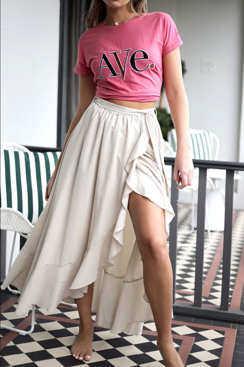Elastic waist with an optional tie it resembles a wrap skirt.