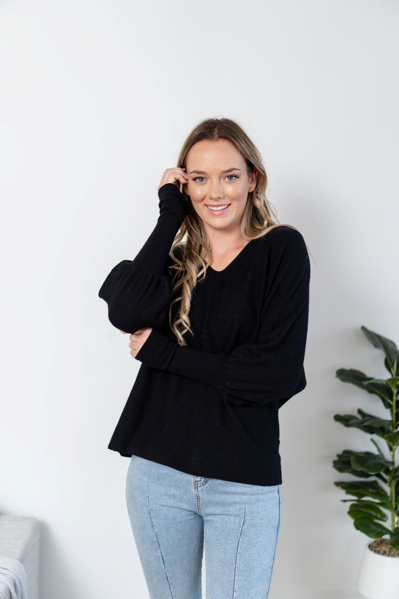 V-Neck Box Knit Balloon-Sleeved Batwing Jumper