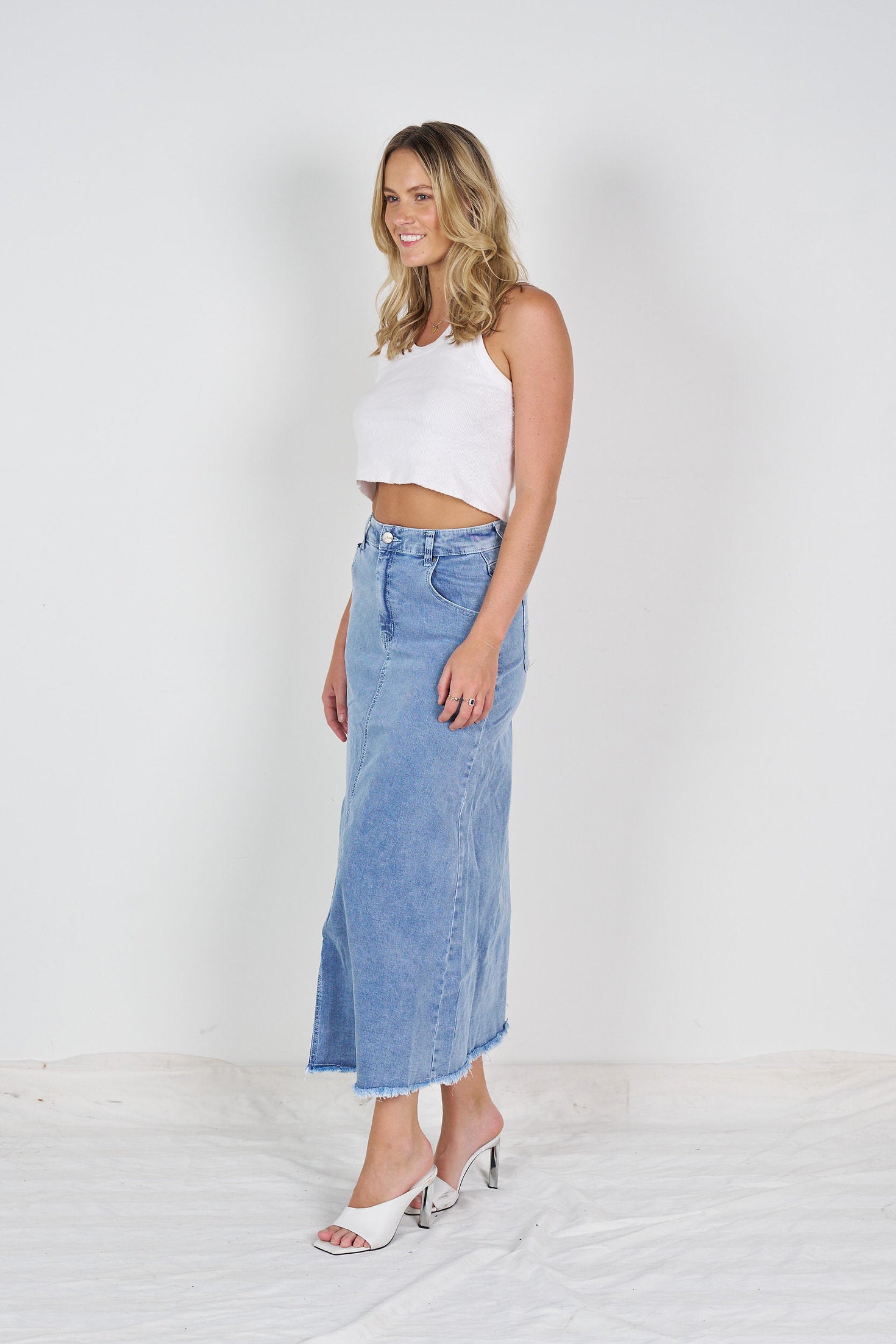 Wakee Maxi Denim Skirt With Frayed Hem 7131