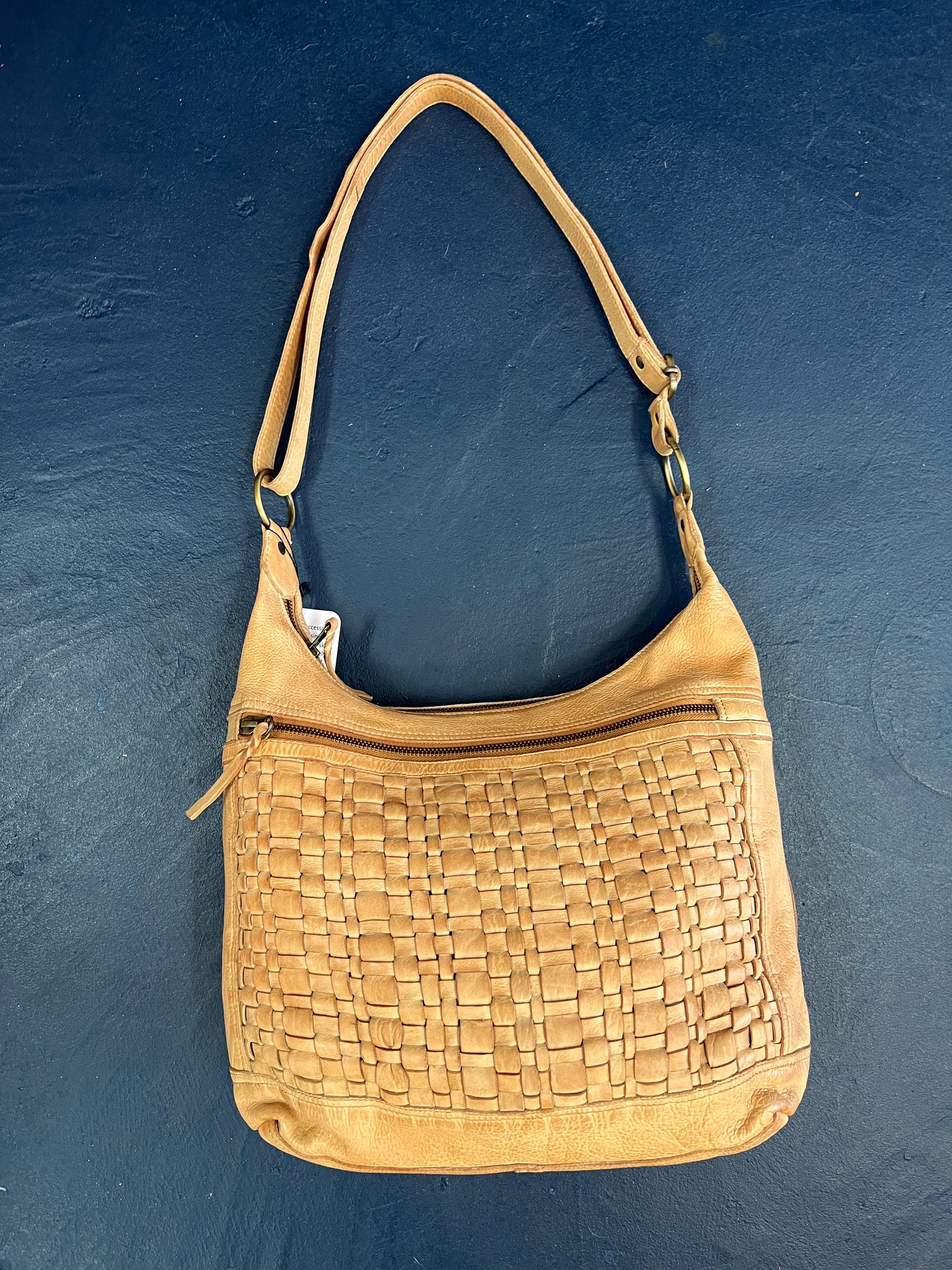 This bag is awesome! Gorgeous woven soft leather with adjustable cross body or shoulder strap. There are 3 zip pockets for storing all your goodies. Comes in Black and Tan .